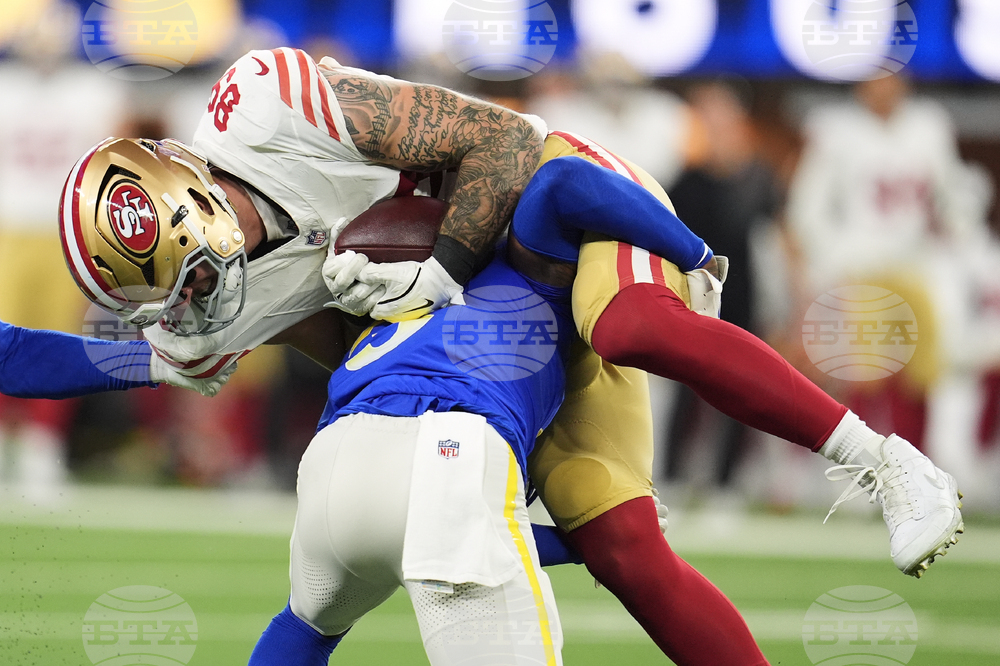 San Francisco 49ers middle linebacker Fred Warner, left, and linebacker Dee Winters, right, tackle Los Angeles Rams running back Kyren Williams during the first half of an NFL football game, Thursday, Oct. 2, 2025, in Inglewood, Calif. (AP Photo/Jessie Alcheh)