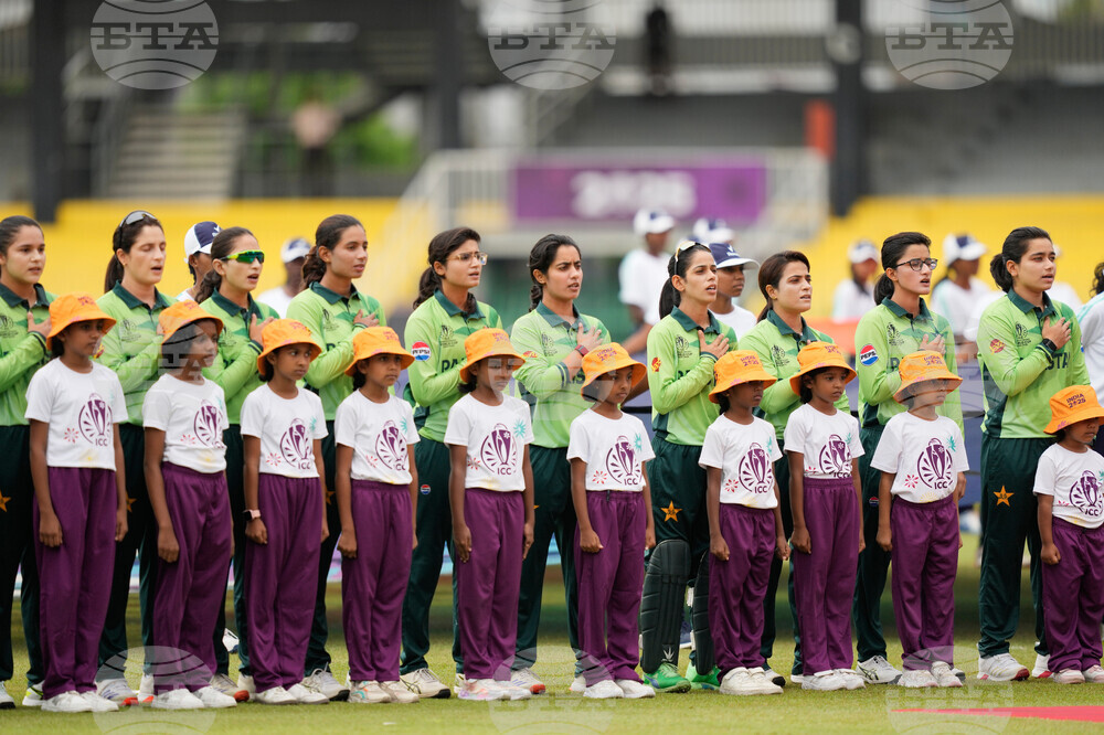 Pakistan's team members stand for their national anthem before the ICC Women's Cricket World Cup match between India and Pakistan at Premadasa Stadium in Colombo, Sri Lanka, Sunday, Oct, 5, 2025. (AP Photo/Eranga Jayawardena)