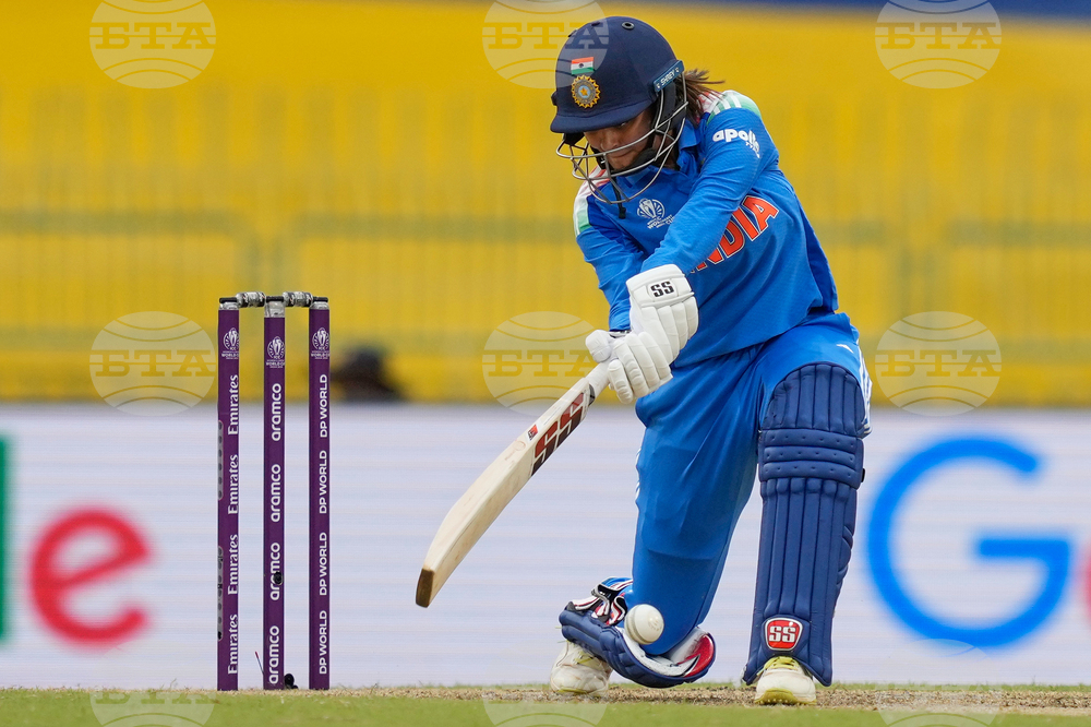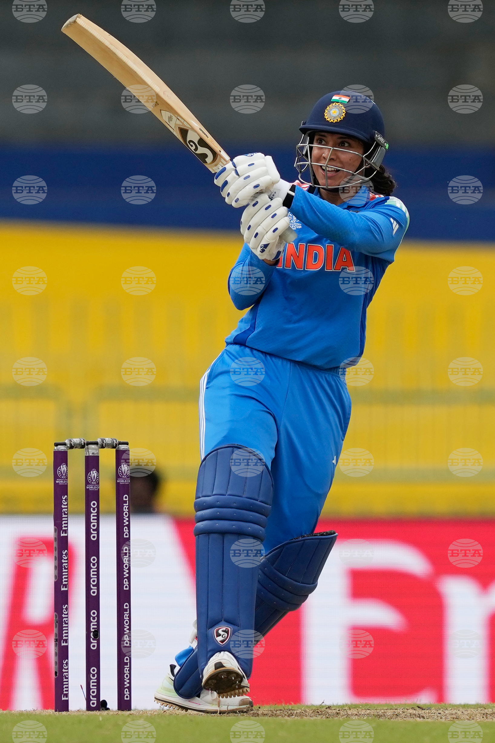 India's Smriti Mandhana plays a shot during the ICC Women's Cricket World Cup match between India and Pakistan at Premadasa Stadium in Colombo, Sri Lanka, Sunday, Oct, 5, 2025. (AP Photo/Eranga Jayawardena)