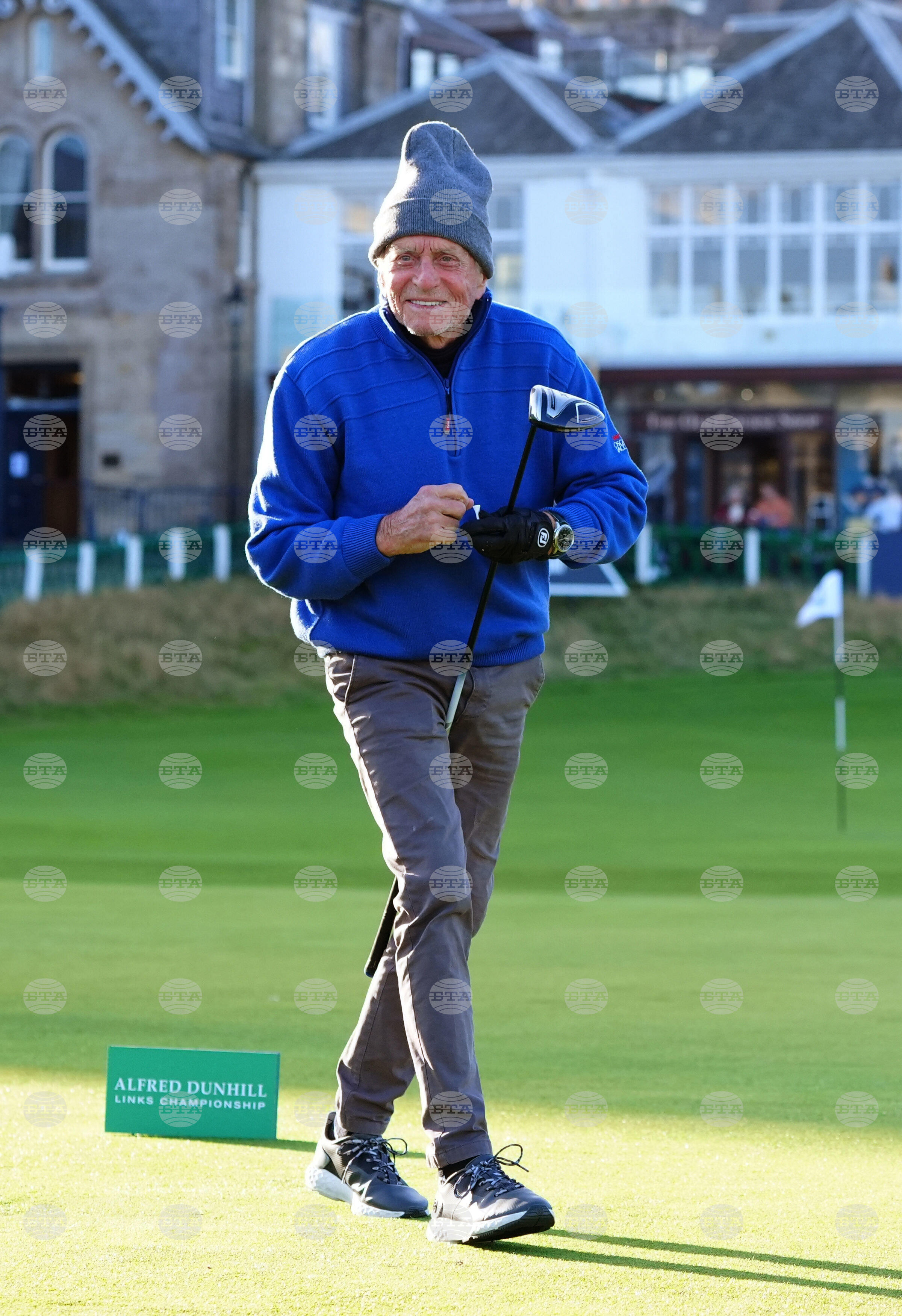 Actor Michael Douglas on the 1st tee during day four of the 2025 Alfred Dunhill Links Championship at the Old Course, St Andrews, Scotland, Sunday, Oct. 5, 2025. (Jane Barlow/PA via AP)