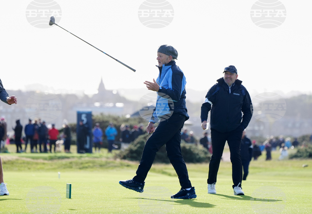 Bill Murray on the 5th tee during day four during day four of the 2025 Alfred Dunhill Links Championship at the Old Course, St Andrews, Scotland, Sunday, Oct. 5, 2025. (Jane Barlow/PA via AP)