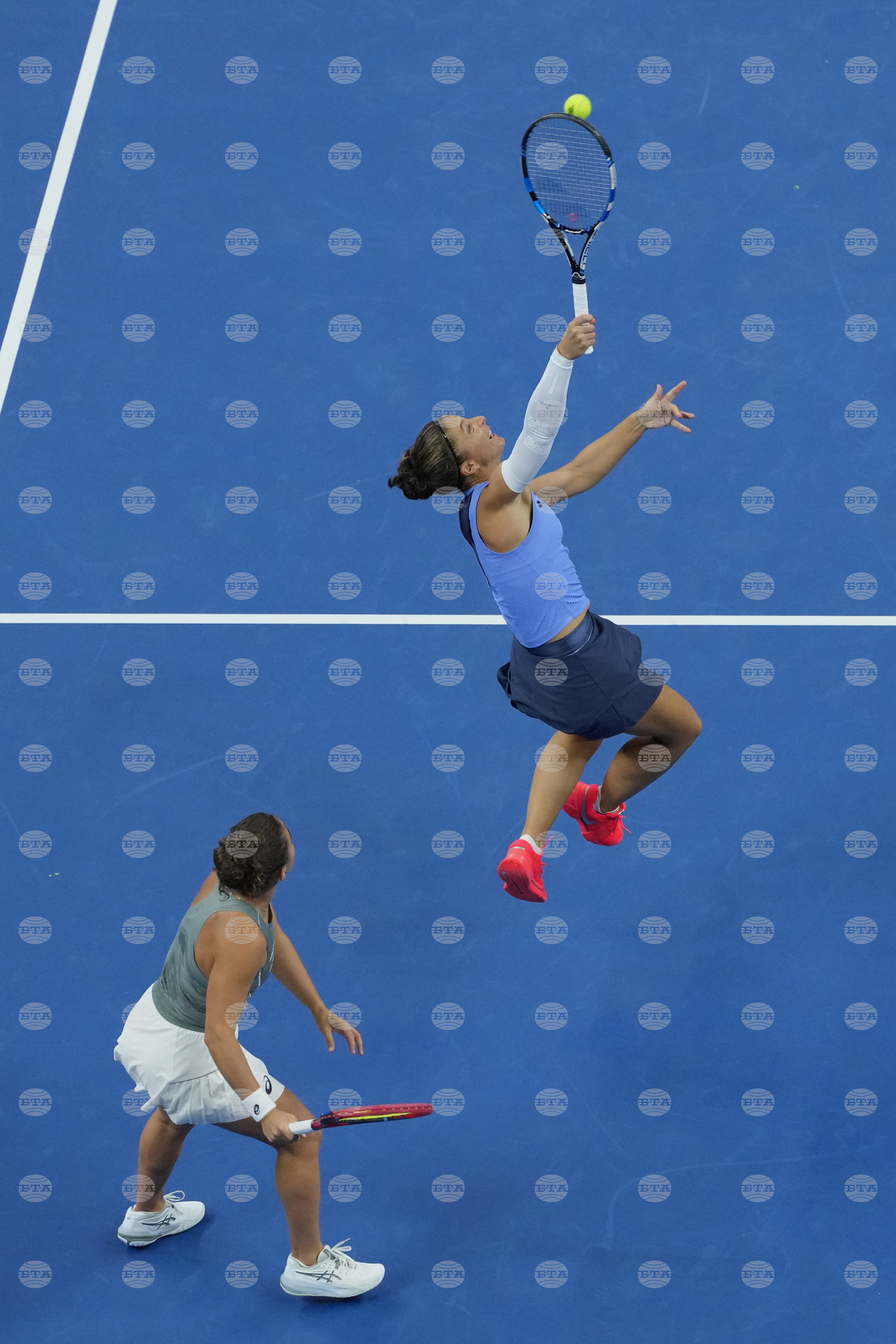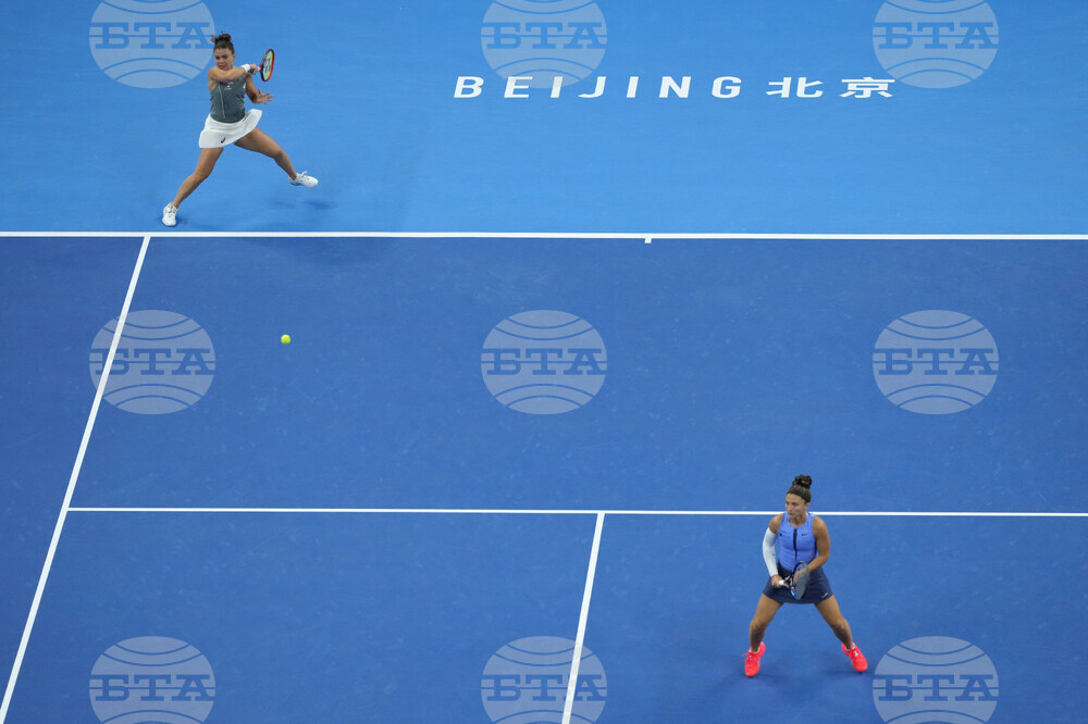 Jasmine Paolini and Sara Errani, of Italy play against Miyu Kato, of Japan and Fanny Stollar, of Hungary during the women's doubles final match of the China Open tennis tournament, at the National Tennis Center, in Beijing, Sunday, Oct. 5, 2025. (AP Photo/Andy Wong)