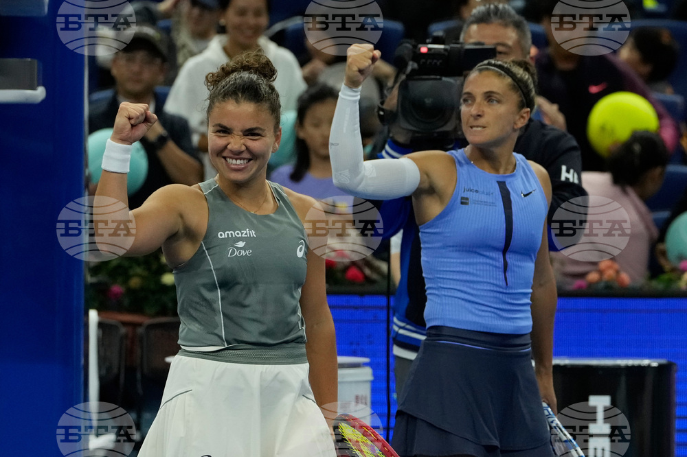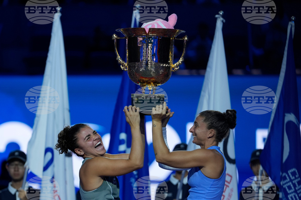 Sara Errani and Jasmine Paolini of Italy celebrate after defeating Miyu Kato of Japan and Fanny Stollar of Hungary in the women's doubles final match of the China Open tennis tournament in Beijing, China, Sunday, Oct. 5, 2025.(AP Photo/Ng Han Guan)
