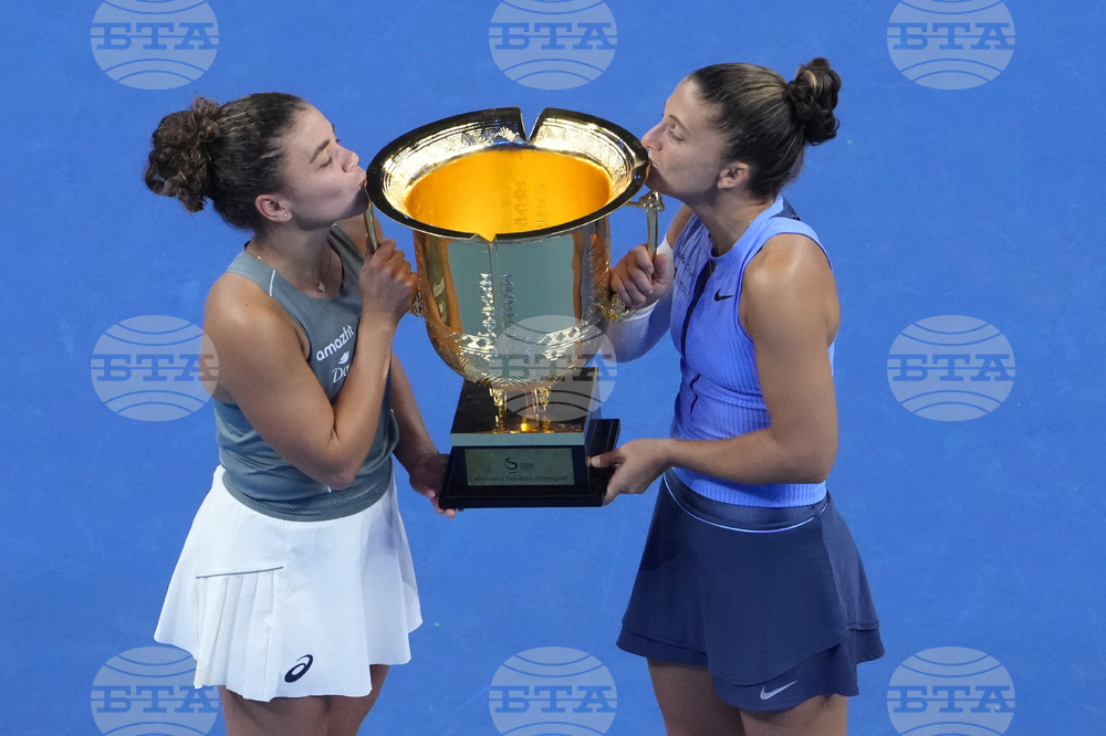 Jasmine Paolini and Sara Errani, of Italy pose with their winning trophy after defeating Miyu Kato, of Japan and Fanny Stollar, of Hungary in the women's doubles final match of the China Open tennis tournament, at the National Tennis Center, in Beijing, Sunday, Oct. 5, 2025. (AP Photo/Andy Wong)