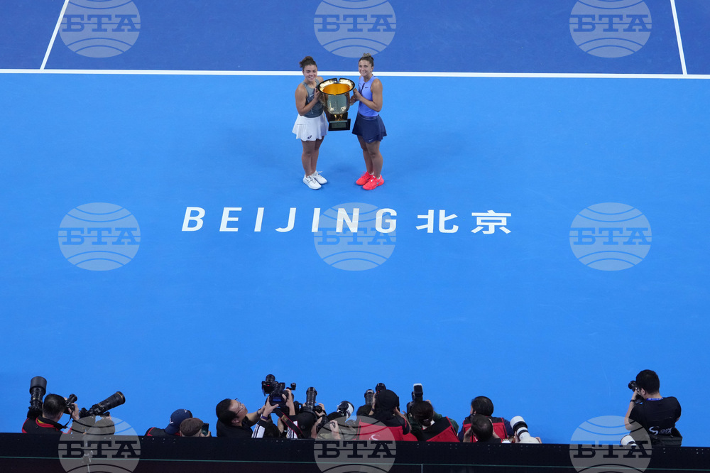 Sara Errani and Jasmine Paolini of Italy pose with their trophy after defeating Miyu Kato of Japan and Fanny Stollar of Hungary in the women's doubles final match of the China Open tennis tournament in Beijing, China, Sunday, Oct. 5, 2025.(AP Photo/Ng Han Guan)