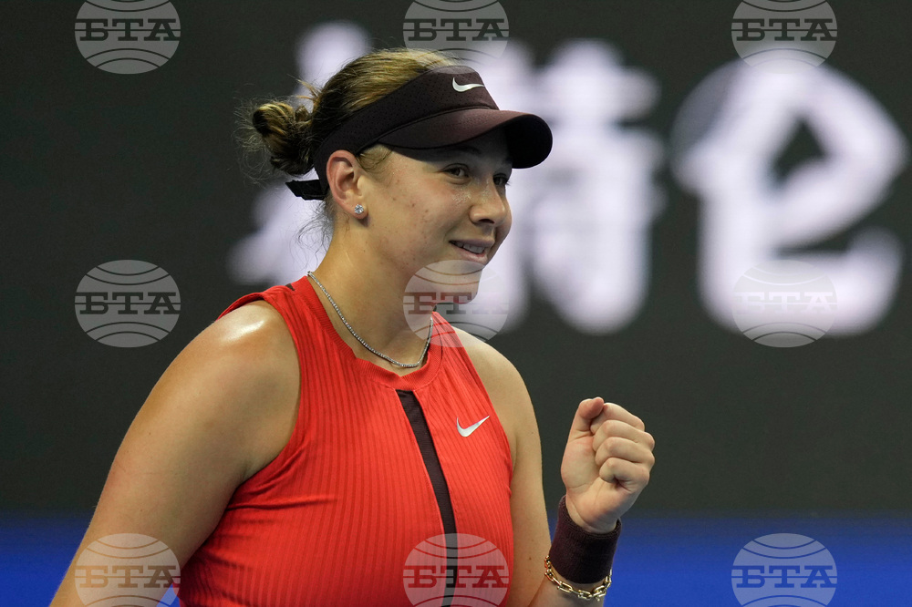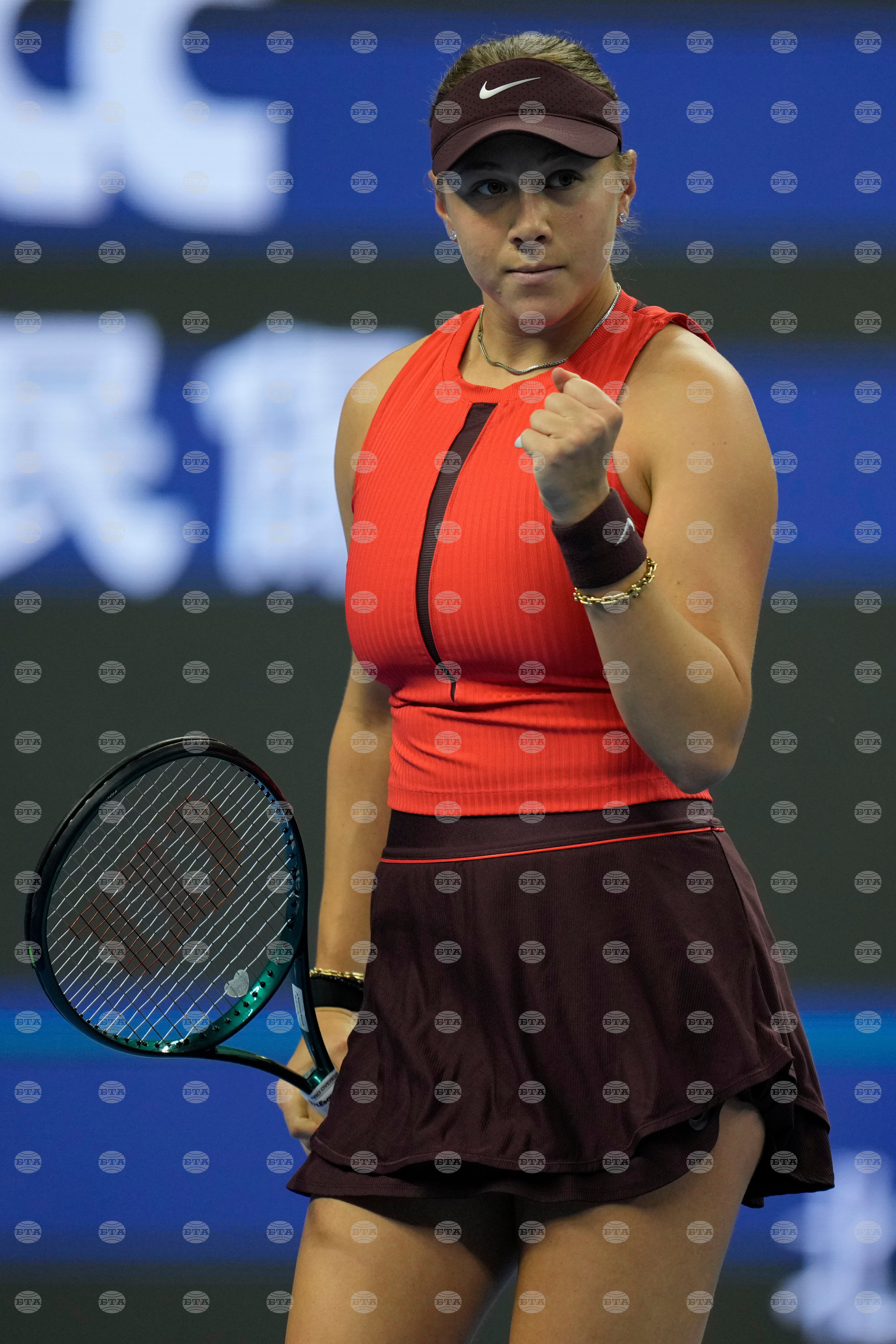 Linda Noskova, of the Czech Republic reacts after scoring a break point against Jessica Pegula, of the United States during the women's singles semifinals match of the China Open tennis tournament, at the National Tennis Center, in Beijing, Saturday, Oct. 4, 2025. (AP Photo/Andy Wong)