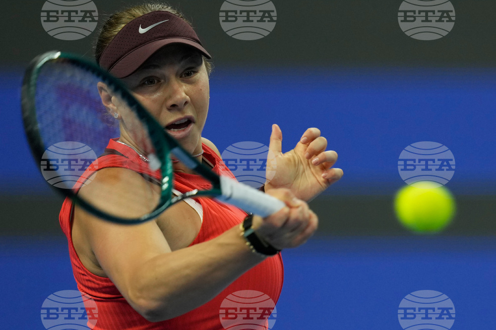Amanda Anisimova, of the United States returns a backhand shot from Linda Noskova, of the Czech Republic during the women's singles final match of the China Open tennis tournament, at the National Tennis Center, in Beijing, Sunday, Oct. 5, 2025. (AP Photo/Andy Wong)
