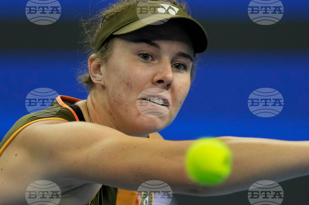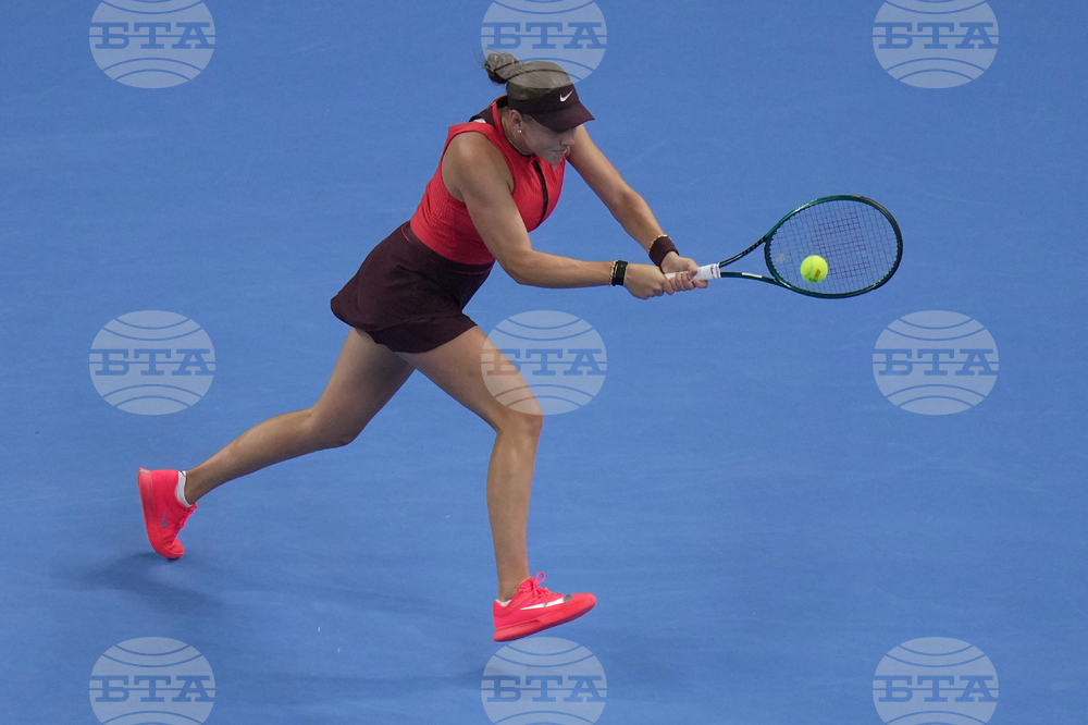 Linda Noskova, of the Czech Republic plays a backhand return rto Jessica Pegula, of the United States during the women's singles semifinals match of the China Open tennis tournament, at the National Tennis Center, in Beijing, Saturday, Oct. 4, 2025. (AP Photo/Andy Wong)