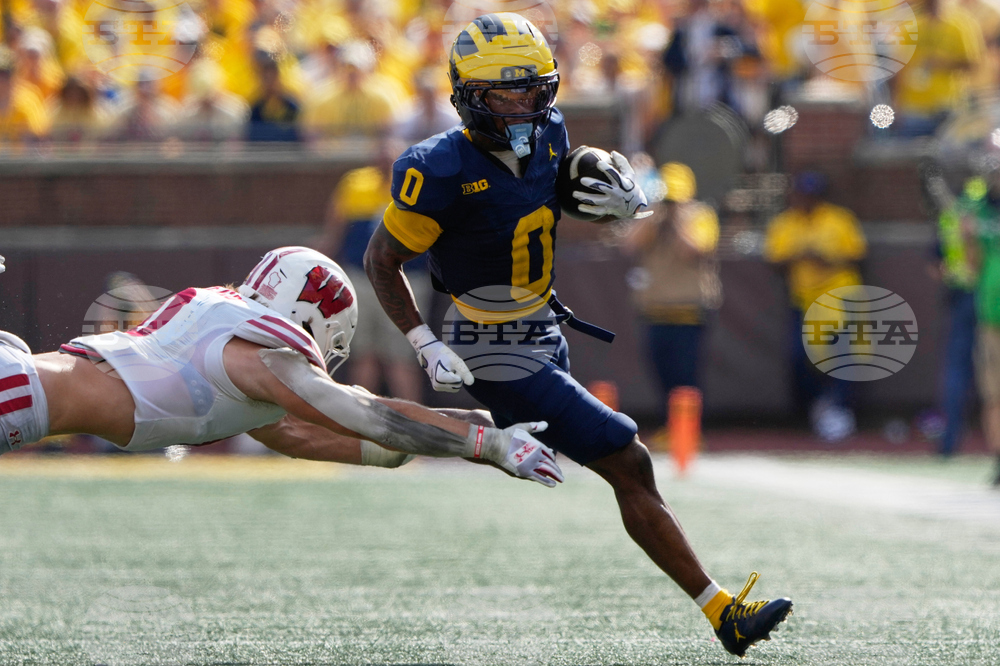 Michigan wide receiver Donaven McCulley, right, catches a pass against Wisconsin defensive back D'Yoni Hill during the second half of an NCAA college football game Saturday, Oct. 4, 2025, in Ann Arbor, Mich. (AP Photo/Ryan Sun)