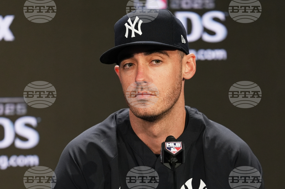 New York Yankees Cody Bellinger talks to reporters at Yankee Stadium in New York, Monday, Oct. 6, 2025. (AP Photo/Seth Wenig)