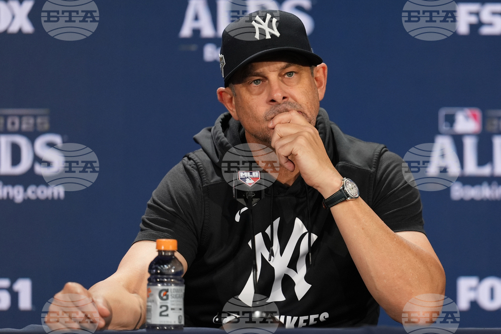 New York Yankees manager Aaron Boone talks to reporters at Yankee Stadium in New York, Monday, Oct. 6, 2025. (AP Photo/Seth Wenig)