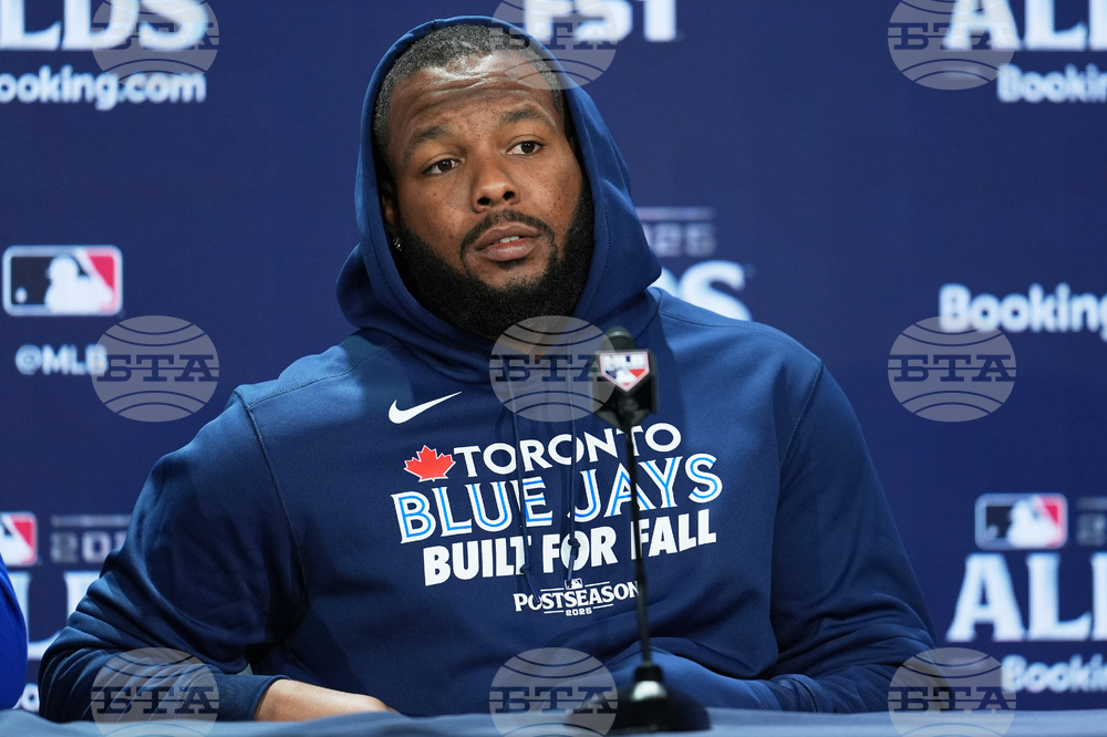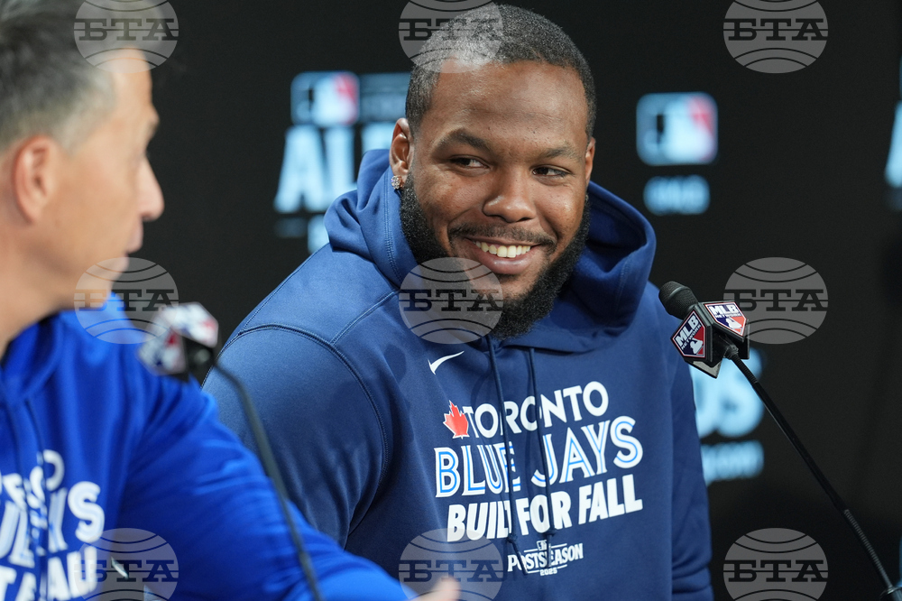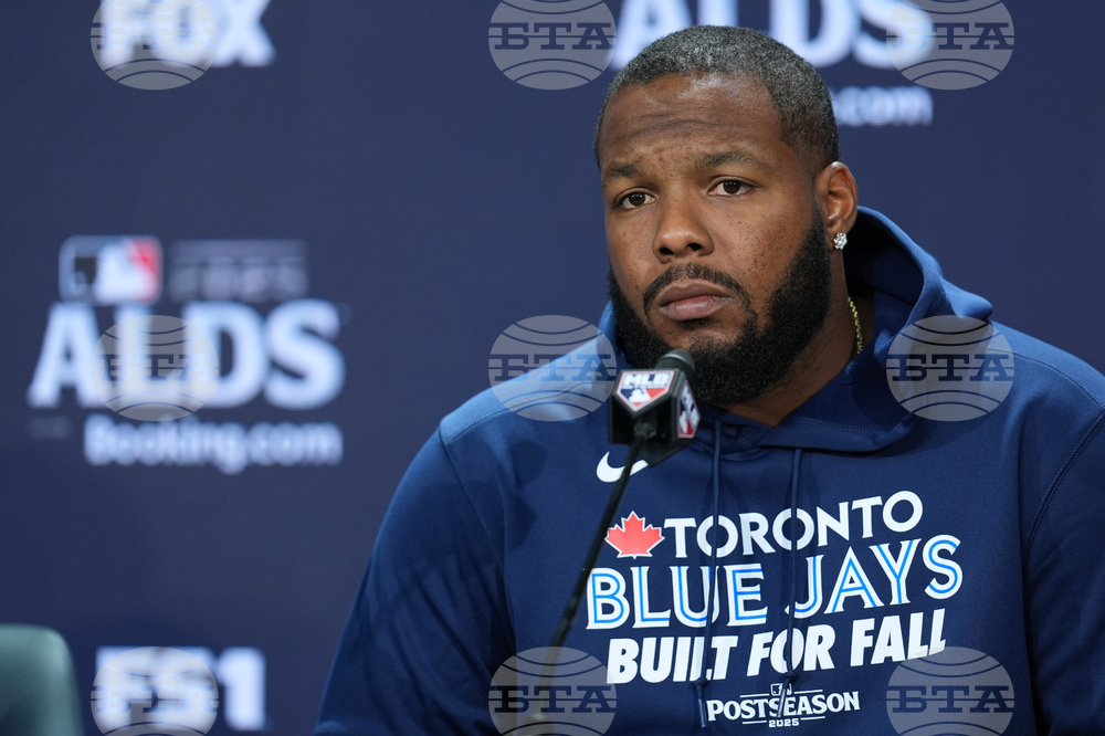 Toronto Blue Jays Vladimir Guerrero Jr. talks to reporters at Yankee Stadium in New York, Monday, Oct. 6, 2025. (AP Photo/Seth Wenig)