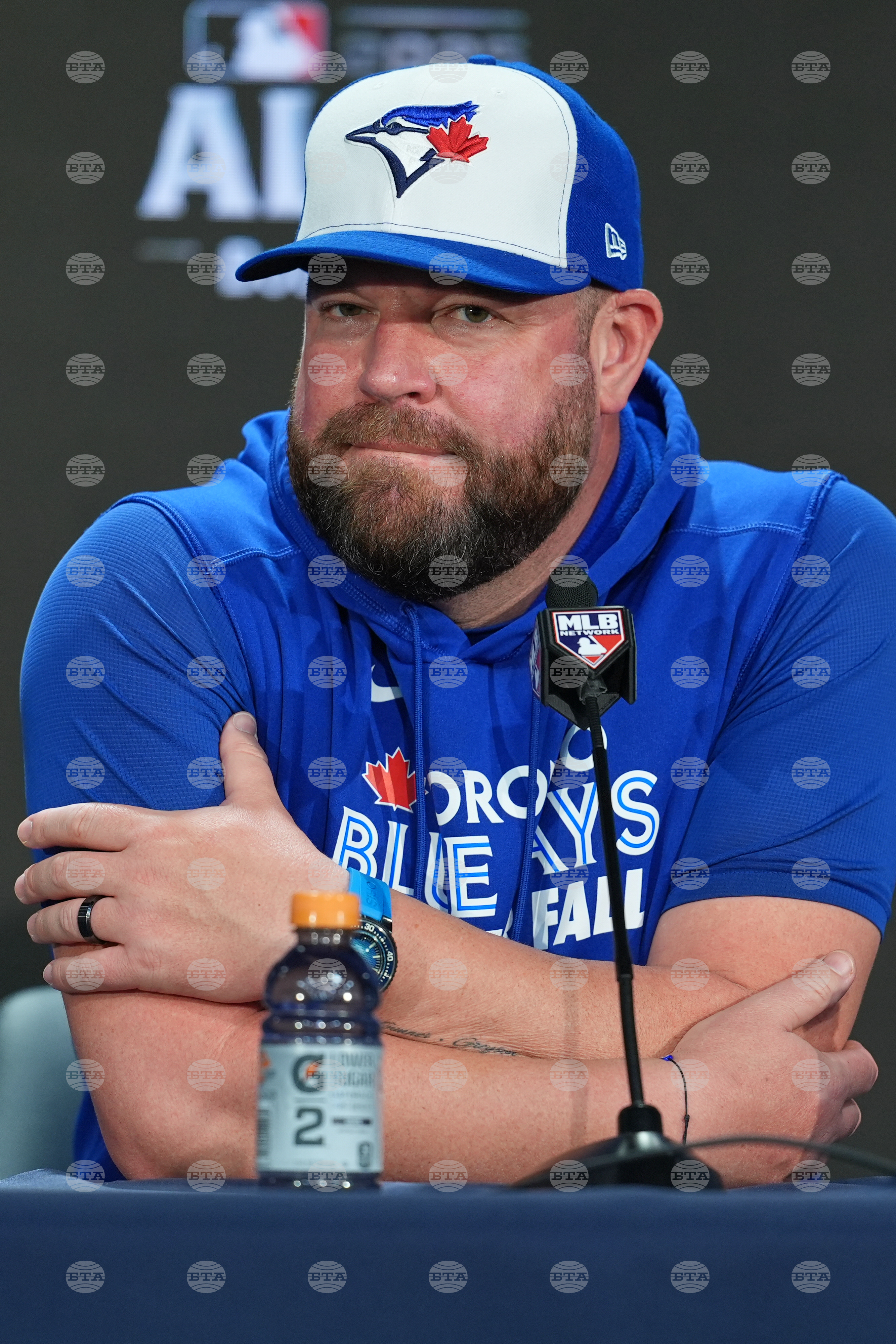 Toronto Blue Jays manager John Schneider reacts during a batting practice at Yankee Stadium in New York, Monday, Oct. 6, 2025. (AP Photo/Seth Wenig)
