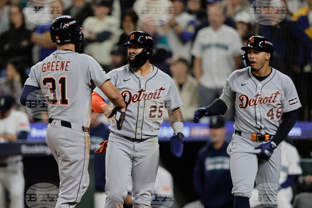 Detroit Tigers' Riley Greene runs to score the tying run off of a double hit by Spencer Torkelson during the eighth inning in Game 2 of baseball's American League Division Series against the Seattle Mariners, Sunday, Oct. 5, 2025, in Seattle. (AP Photo/John Froschauer)