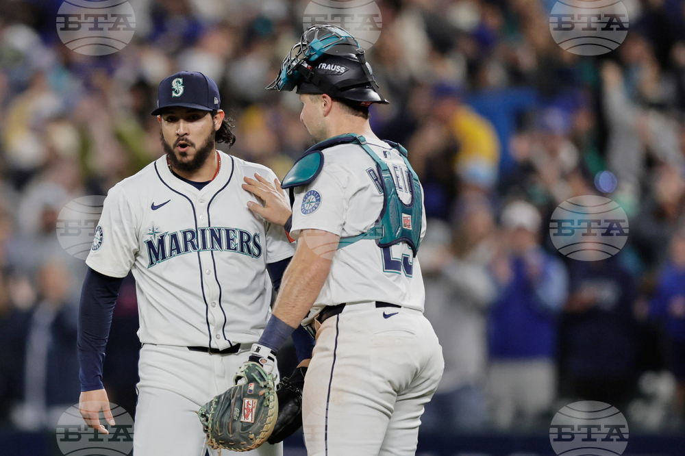 Seattle Mariners relief pitcher Eduard Bazardo reacts after Detroit Tigers' Parker Meadows popped out to shortstop J.P. Crawford to end the top of the seventh inning in Game 2 of baseball's American League Division Series, Sunday, Oct. 5, 2025, in Seattle. (AP Photo/Lindsey Wasson)