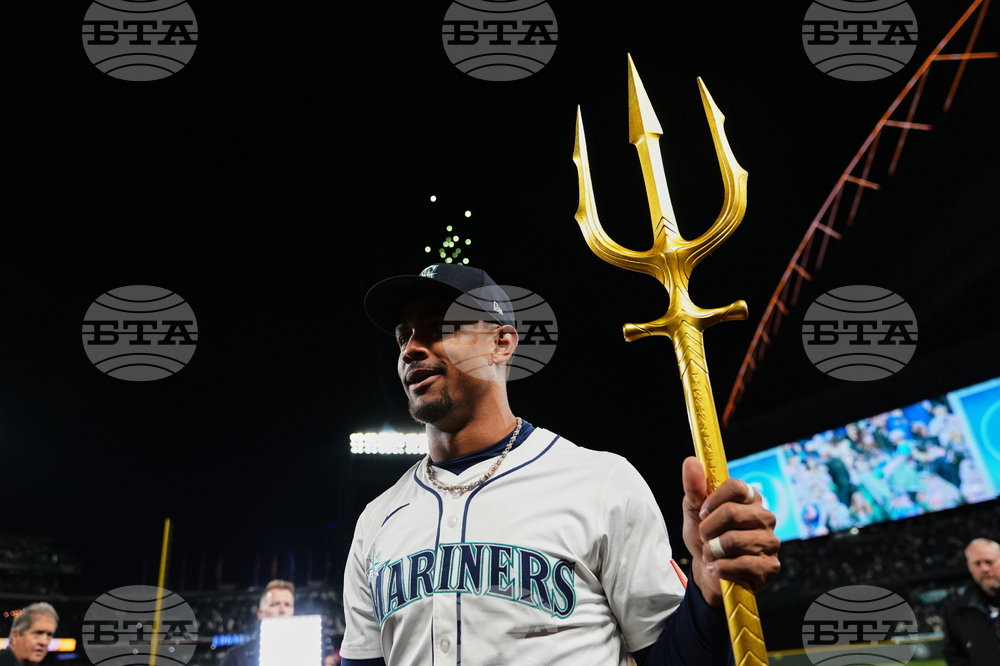 The Seattle Mariners celebrate after the team's win in Game 2 of baseball's American League Division Series against the Detroit Tigers, Sunday, Oct. 5, 2025, in Seattle. (AP Photo/Lindsey Wasson)