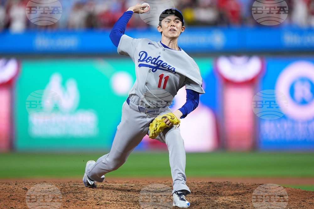 Los Angeles Dodgers relief pitcher Roki Sasaki follows through his throw during the ninth inning in Game 2 of baseball's National League Division Series against the Philadelphia Phillies, Monday, Oct. 6, 2025, in Philadelphia. (AP Photo/Matt Slocum)