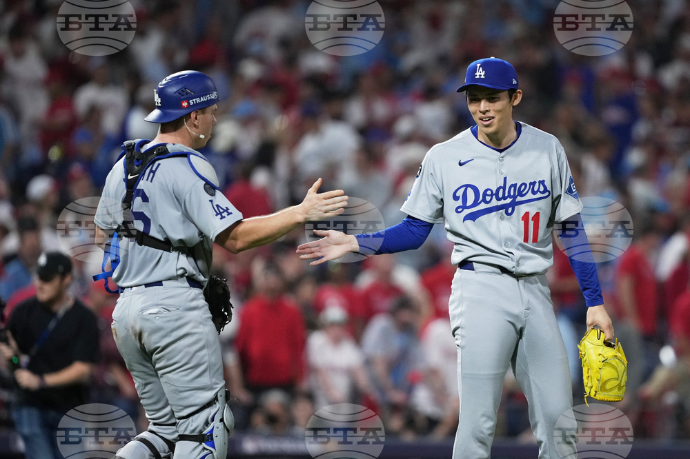 Fans cheer as Los Angeles Dodgers relief pitcher Blake Treinen walks back to the dugout after being relieved during the ninth inning in Game 2 of baseball's National League Division Series against the Philadelphia Phillies, Monday, Oct. 6, 2025, in Philadelphia. (AP Photo/Matt Slocum)