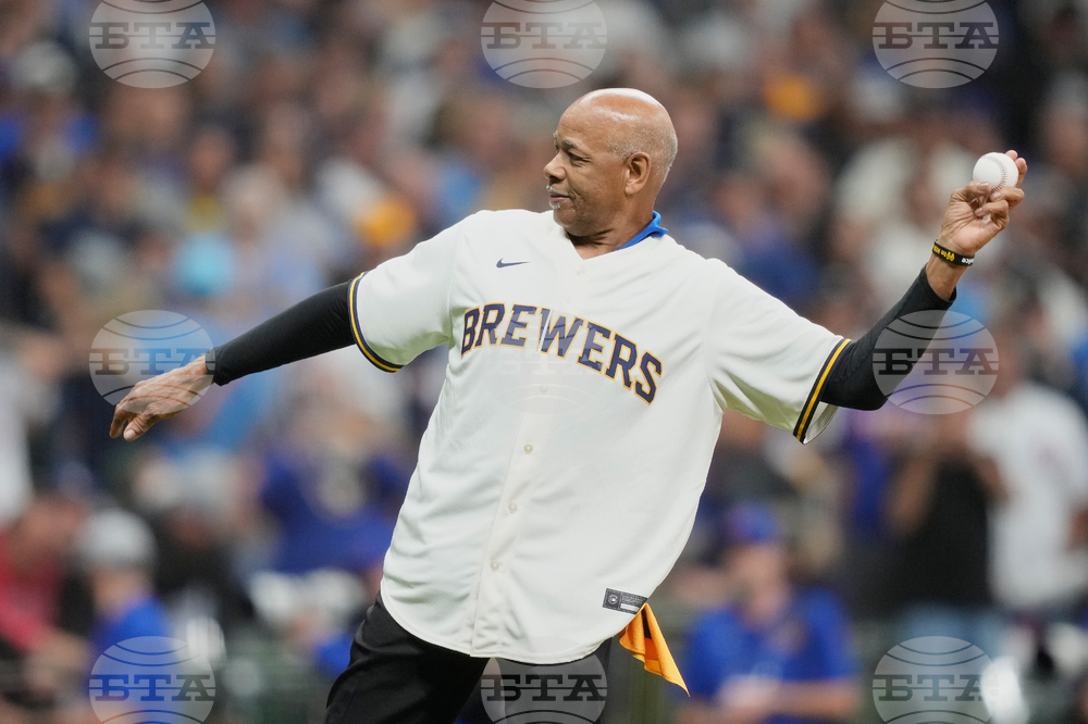 Former Milwaukee Brewers player Cecil Cooper throws out a ceremonial first pitch before Game 2 of baseball's National League Division Series against the Chicago Cubs, Monday, Oct. 6, 2025, in Milwaukee. (AP Photo/Kayla Wolf)