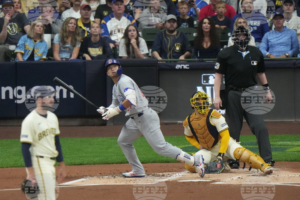Chicago Cubs' Seiya Suzuki (27) bats during the first inning of Game 2 of baseball's National League Division Series against the Milwaukee Brewers Monday, Oct. 6, 2025, in Milwaukee. (AP Photo/Kayla Wolf)