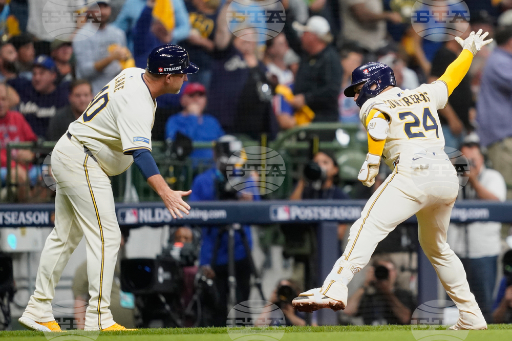 Milwaukee Brewers' William Contreras (24) celebrates with third base coach Jason Lane (40) after hitting a solo home run during the third inning of Game 2 of baseball's National League Division Series against the Chicago Cubs Monday, Oct. 6, 2025, in Milwaukee. (AP Photo/Kayla Wolf)