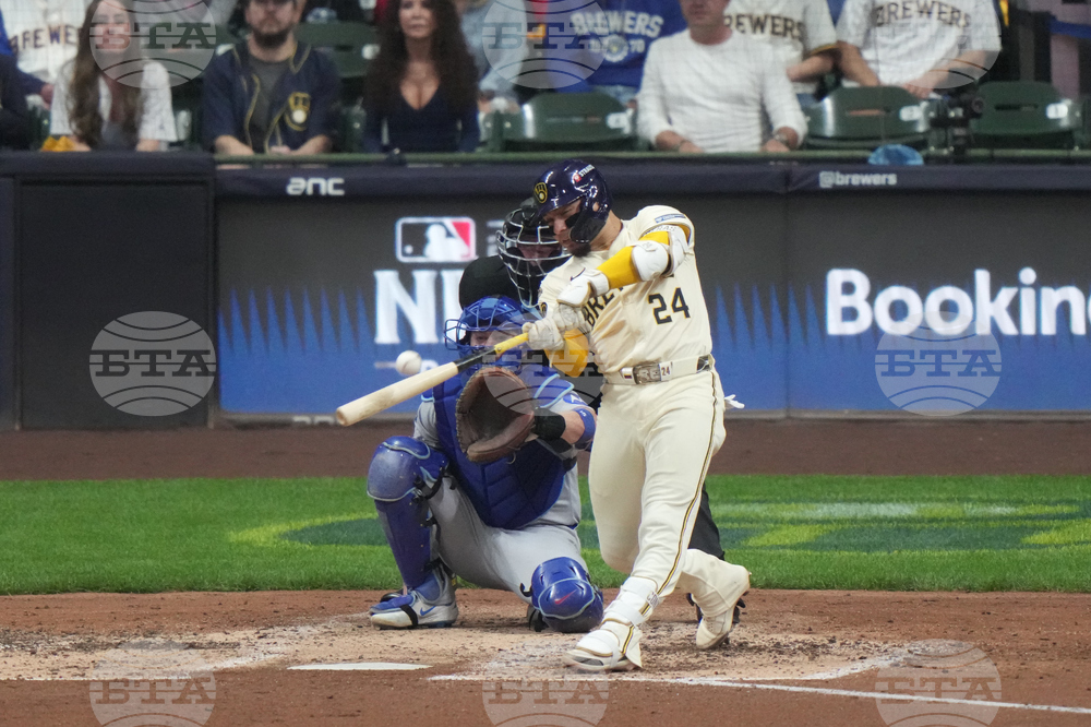 Milwaukee Brewers' Christian Yelich hits a single during the seventh inning of Game 2 of baseball's National League Division Series against the Chicago Cubs Monday, Oct. 6, 2025, in Milwaukee. (AP Photo/Morry Gash)