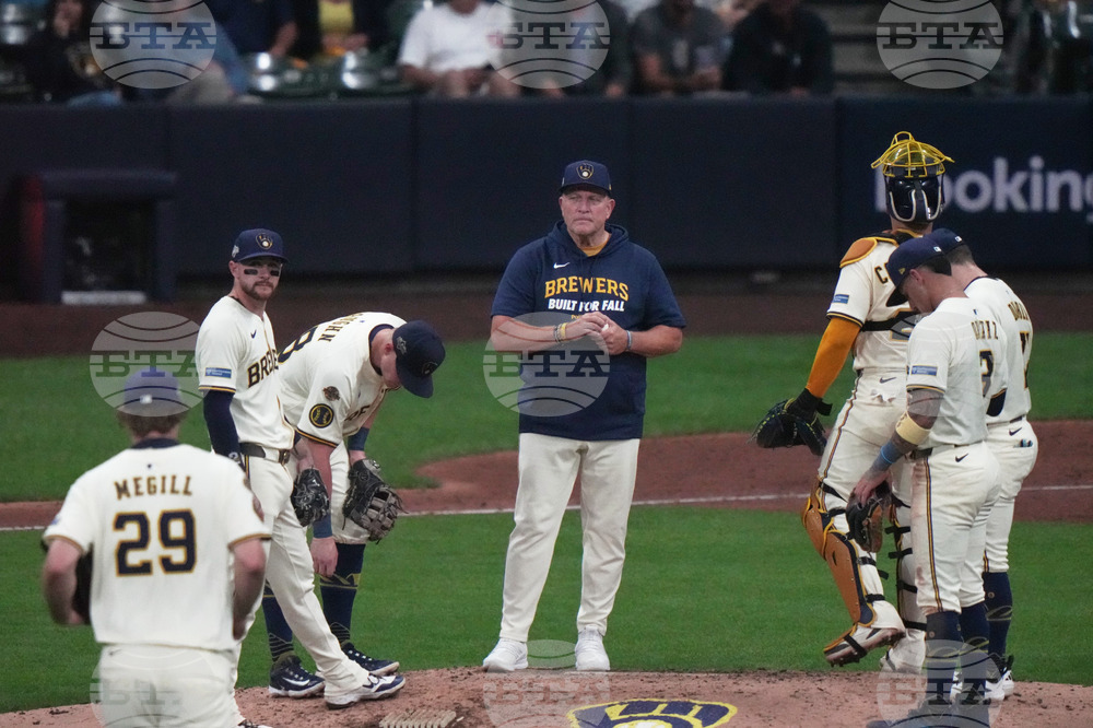 Milwaukee Brewers manager Milwaukee looks on before Game 2 of baseball's National League Division Series against the Chicago Cubs, Monday, Oct. 6, 2025, in Milwaukee. (AP Photo/Kayla Wolf)