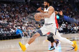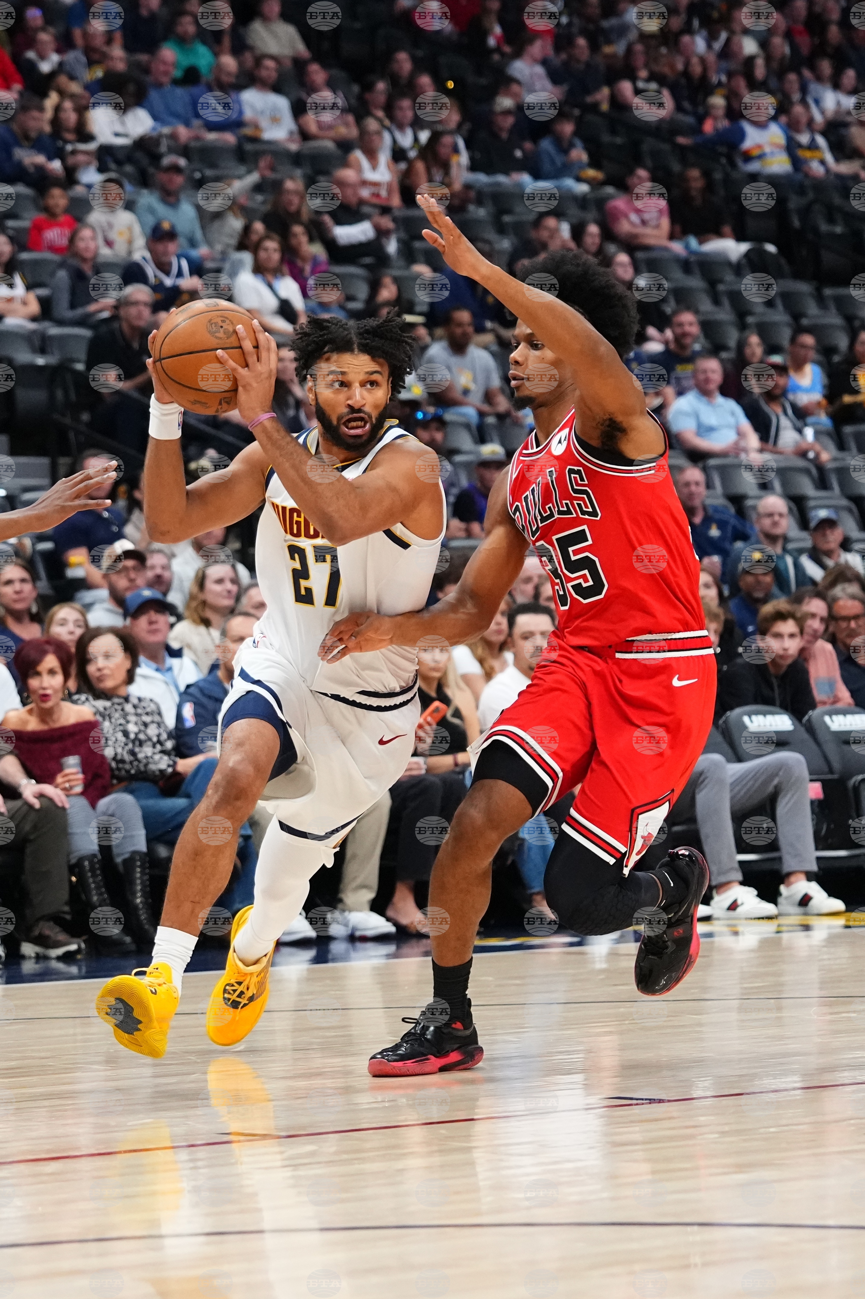 Denver Nuggets guard Jamal Murray (27) drives to the basket against Chicago Bulls guard Isaac Okoro (35) during the first half of a preseason NBA basketball game Tuesday, Oct. 14, 2025, in Denver. (AP Photo/Jack Dempsey)