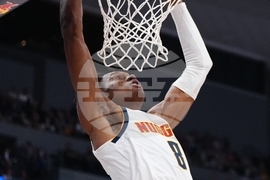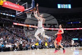 Denver Nuggets guard Peyton Watson dunks against the Chicago Bulls during the first half of a preseason NBA basketball game Tuesday, Oct. 14, 2025, in Denver. (AP Photo/Jack Dempsey)