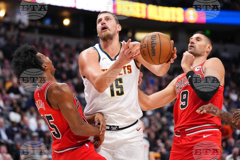 Denver Nuggets center Nikola Jokić (15) is fouled by Chicago Bulls forward Isaac Okoro (35) as Chicago Bulls center Nikola Vučević (9) looks on during the first half of a preseason NBA basketball game Tuesday, Oct. 14, 2025, in Denver. (AP Photo/Jack Dempsey)