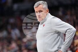 Chicago Bulls Head Coach Billy Donovan looks on against the Denver Nuggets during the first half of a preseason NBA basketball game Tuesday, Oct. 14, 2025, in Denver. (AP Photo/Jack Dempsey)