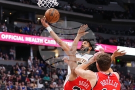 Chicago Bulls forward Patrick Williams (44) passes against Denver Nuggets forward Aaron Gordon (32) during the first half of a preseason NBA basketball game Tuesday, Oct. 14, 2025, in Denver. (AP Photo/Jack Dempsey)