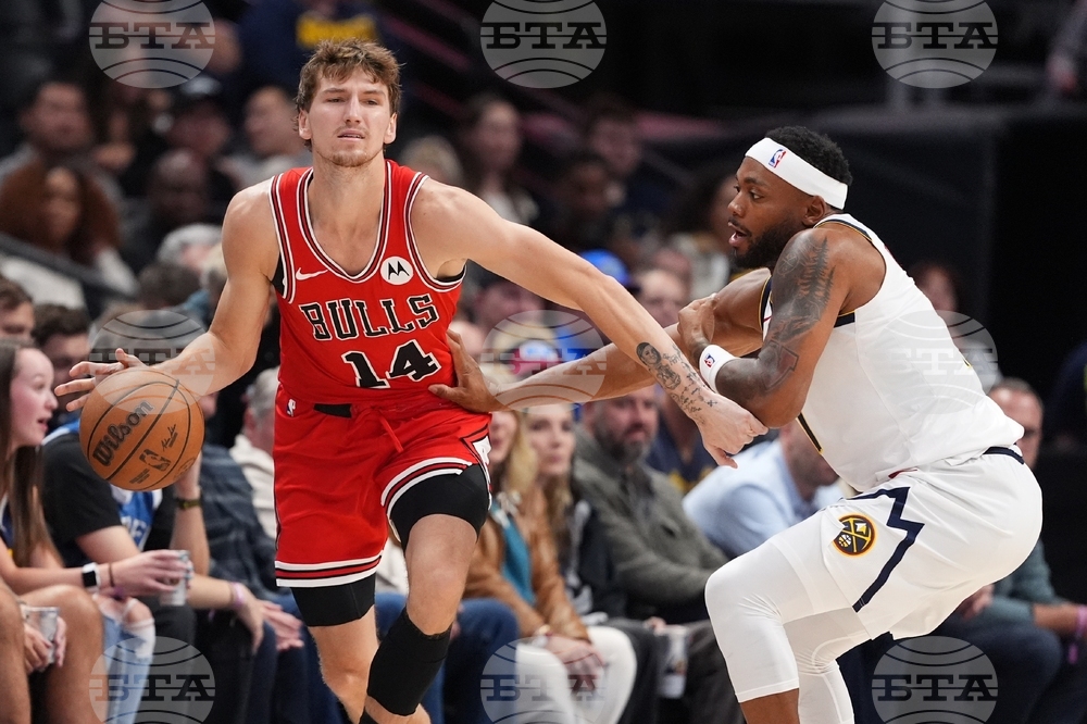 Chicago Bulls forward Matas Buzelis (14) is pressured by Denver Nuggets guard Bruce Brown (11) during the first half of a preseason NBA basketball game Tuesday, Oct. 14, 2025, in Denver. (AP Photo/Jack Dempsey)