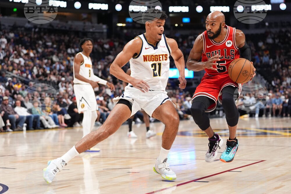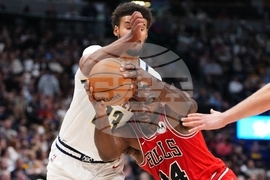 Chicago Bulls guard Ayo Dosunmu grabs a rebound against the Denver Nuggets during the first half of a preseason NBA basketball game Tuesday, Oct. 14, 2025, in Denver. (AP Photo/Jack Dempsey)