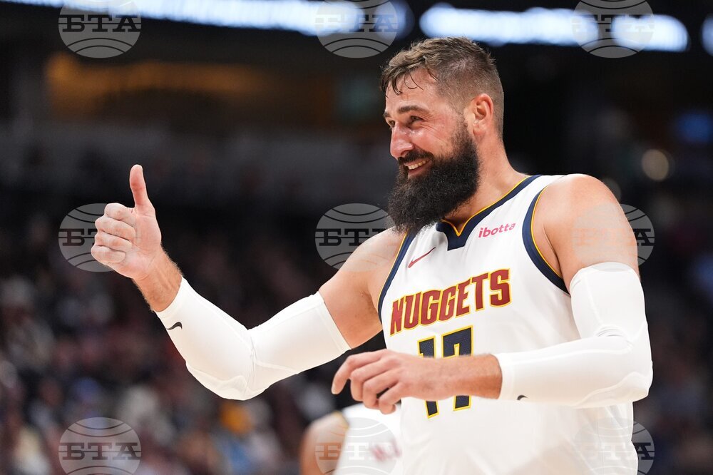 Denver Nuggets center Jonas Valančiūnas gives a thumbs up during the second half of a preseason NBA basketball game against the Chicago Bulls Tuesday, Oct. 14, 2025, in Denver. (AP Photo/Jack Dempsey)