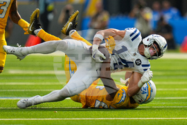 Indianapolis Colts wide receiver Alec Pierce (14) is tackled by Los Angeles Chargers cornerback Benjamin St-Juste (24) during the second half of an NFL football game Sunday, Oct. 19, 2025, in Inglewood, Calif. (AP Photo/Gregory Bull)