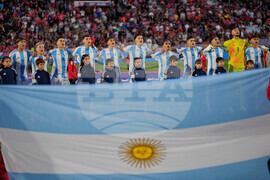 Argentina players sing the national anthem prior to their FIFA U-20 World Cup final soccer match against Morocco in Santiago, Chile, Sunday, Oct. 19, 2025. (AP Photo/Matias Delacroix)