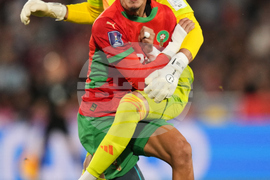 Morocco's goalkeeper Ibrahim Gomis makes a save during the FIFA U-20 World Cup final soccer match against Argentina in Santiago, Chile, Sunday, Oct. 19, 2025. (AP Photo/Gustavo Garello)
