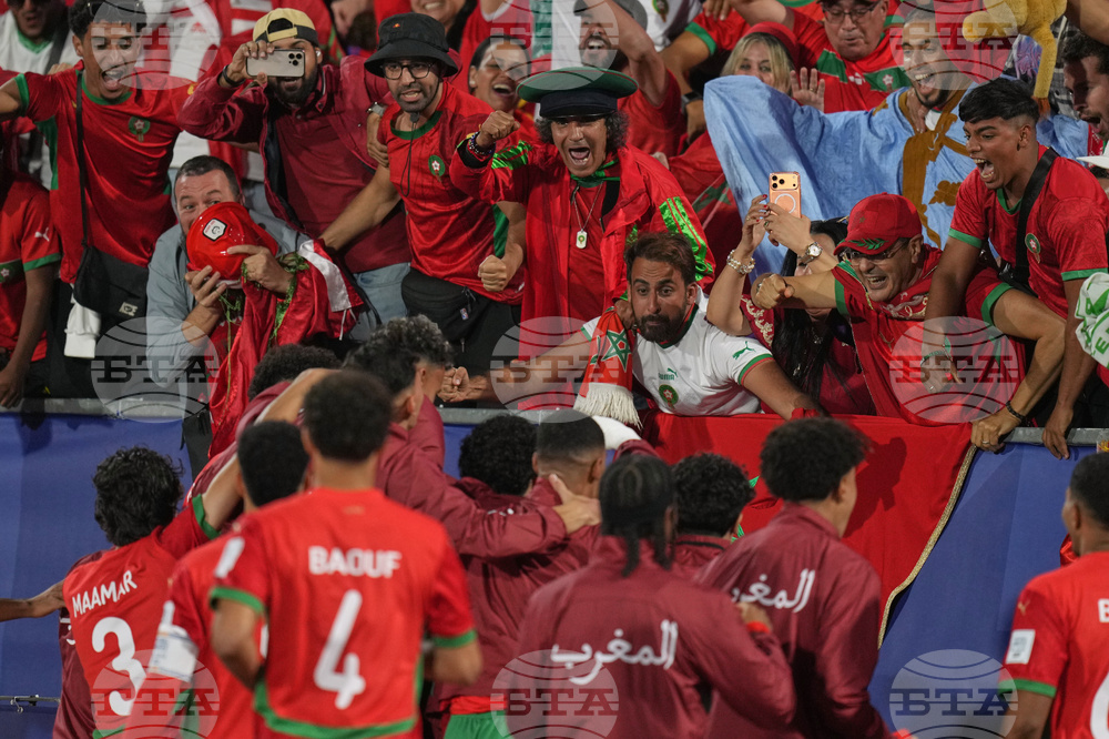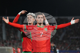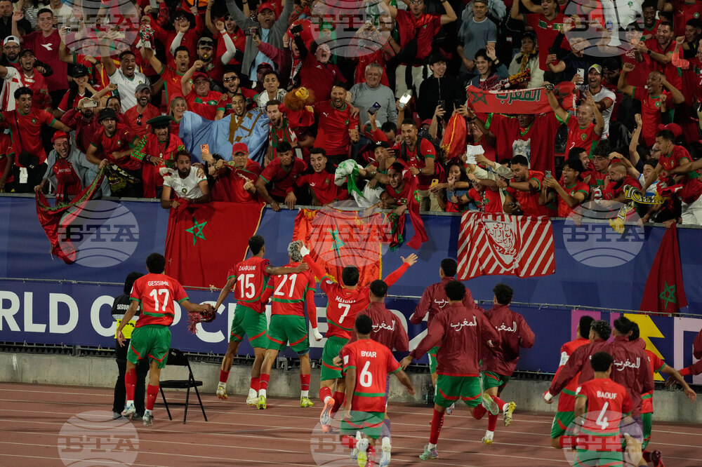 Player of Morocco celebrate with fans after Yassir Zabiri scored his side's opening goal against Argentina during the FIFA U-20 World Cup final soccer match in Santiago, Chile, Sunday, Oct. 19, 2025. (AP Photo/Andre Penner)
