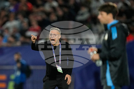 Argentina's coach Diego Pacente walks off the field during the half time of the FIFA U-20 World Cup final soccer match against Morocco in Santiago, Chile, Sunday, Oct. 19, 2025. (AP Photo/Gustavo Garello)