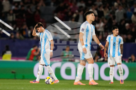 Argentina's Valentino Acuna holds his head after Morocco's Yassir Zabiri scores his side's second goal during the FIFA U-20 World Cup final soccer match in Santiago, Chile, Sunday, Oct. 19, 2025. (AP Photo/Matias Delacroix)