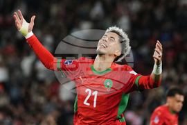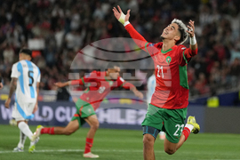 Morocco's Yassir Zabiri (21) celebrates scoring his side's opening goal against Argentina during the FIFA U-20 World Cup final soccer match in Santiago, Chile, Sunday, Oct. 19, 2025. (AP Photo/Gustavo Garello)