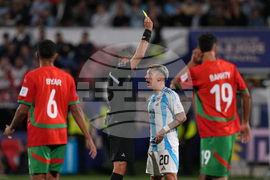 Referee Maurizio Mariani, of Italy, books Argentina's Gianluca Prestianni during the FIFA U-20 World Cup final soccer match in Santiago, Chile, Sunday, Oct. 19, 2025. (AP Photo/Esteban Felix)