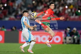 Morocco's Othmane Maamma, left, and Argentina's Juan Villalba vie for the ball during the FIFA U-20 World Cup final soccer match in Santiago, Chile, Sunday, Oct. 19, 2025. (AP Photo/Andre Penner)