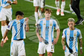 Players of Argentina stand on the field after losing the FIFA U-20 World Cup final soccer match against Morocco in Santiago, Chile, Sunday, Oct. 19, 2025. (AP Photo/Gustavo Garello)