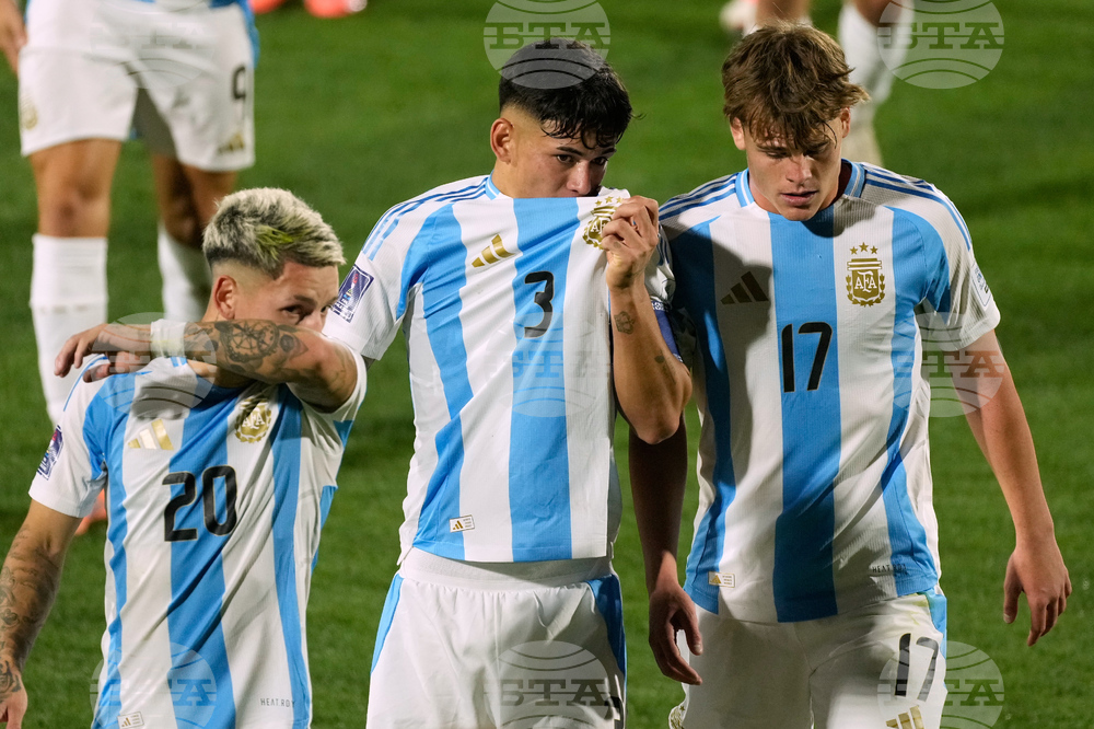 Argentina's goalkeeper Alvaro Busso, left, Gianluca Prestianni, center, and Alejo Sarco walk off the field with second-place medals after the awards ceremony of the FIFA U-20 World Cup final soccer match in Santiago, Chile, Sunday, Oct. 19, 2025. (AP Photo/Gustavo Garello)