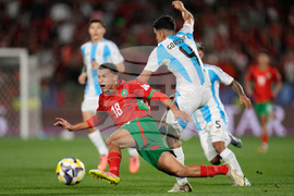 Morocco's Ilias Boumassaoudi, left, and Argentina's Ian Subiabre vie for the ball during the FIFA U-20 World Cup final soccer match in Santiago, Chile, Sunday, Oct. 19, 2025. (AP Photo/Gustavo Garello)