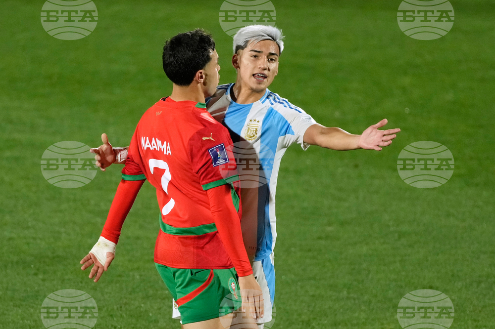 Morocco's Othmane Maamma, right, and Argentina's Maher Carrizo argue during the FIFA U-20 World Cup final soccer match in Santiago, Chile, Sunday, Oct. 19, 2025.(AP Photo/Matias Delacroix)