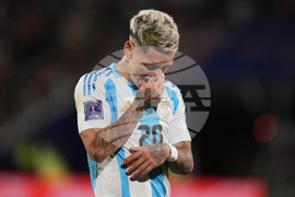 Argentina's Gianluca Prestianni reacts at the end of the FIFA U-20 World Cup final soccer match against Morocco in Santiago, Chile, Sunday, Oct. 19, 2025. (AP Photo/Andre Penner)