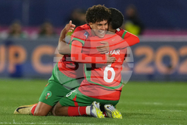 Morocco's Yassir Zabiri, left, celebrates with teammates Othmane Maamma after scoring his side's second goal against Argentina during the FIFA U-20 World Cup final soccer match in Santiago, Chile, Sunday, Oct. 19, 2025.(AP Photo/Andre Penner)